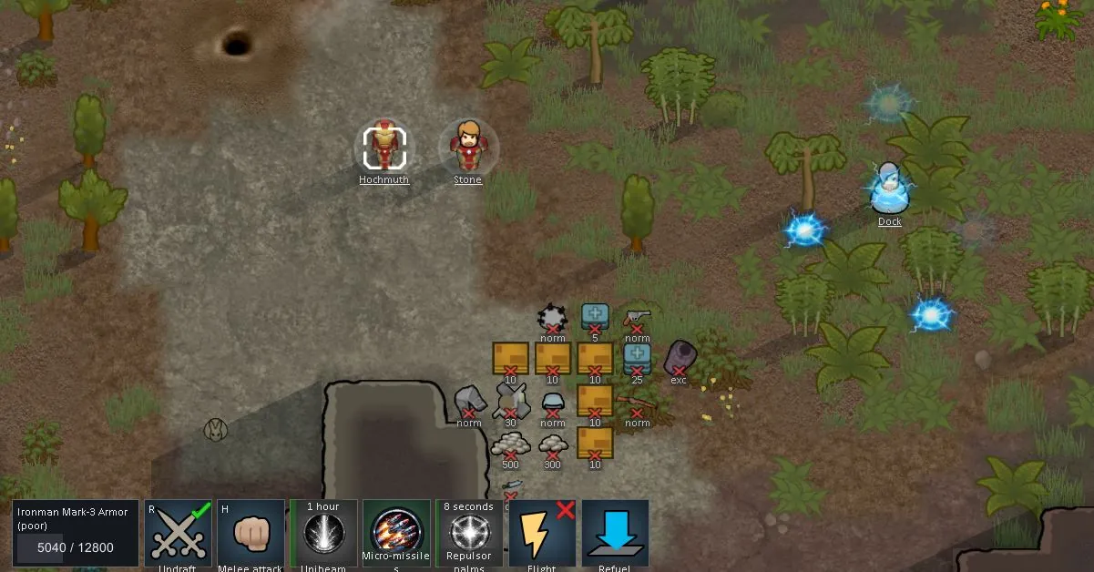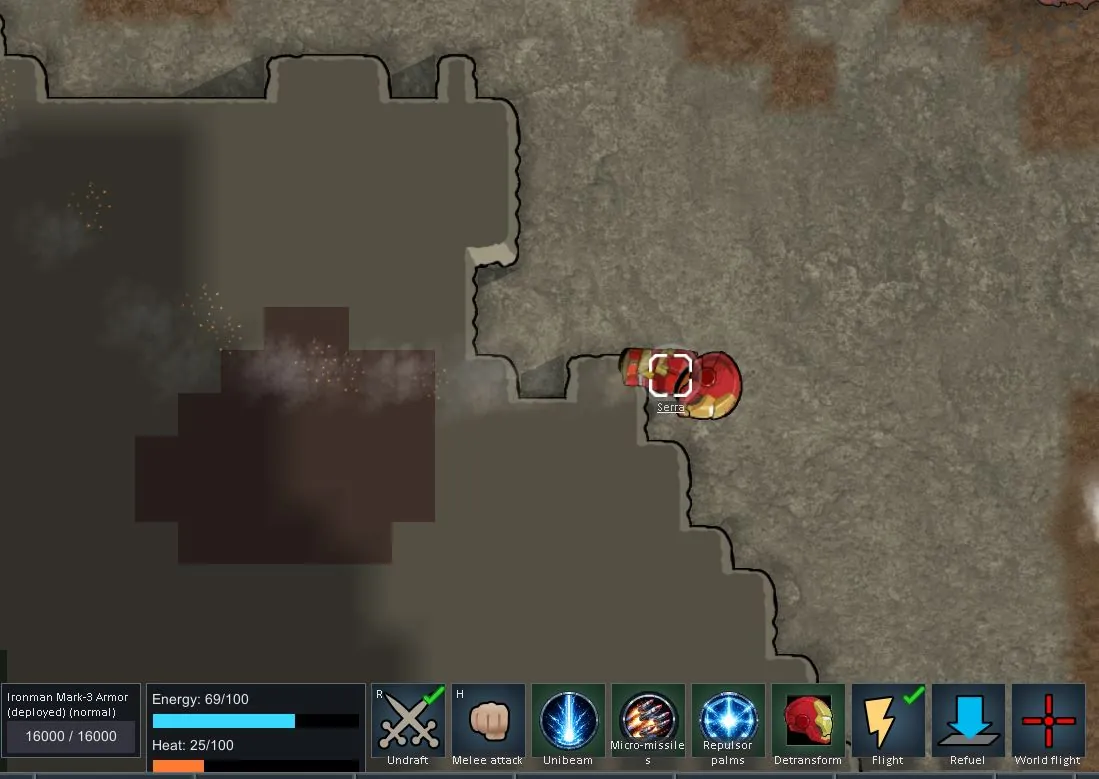 - Abilities: Unibeam, Micro-missiles, Repulsor palms. Flight + World flight (gizmo to fly to another world tile; cost = distance × armor energy).