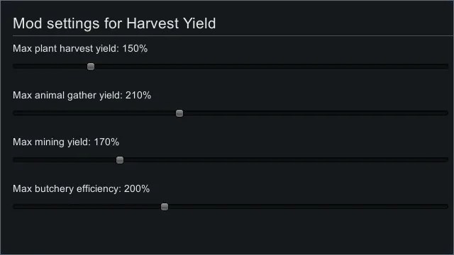 Changes mechanics of [b]plant harvest yield[/b] and [b]animal gather yield[/b] to work similar to mining yield. Quickly edit caps for all yield-related stats in the mod settings.