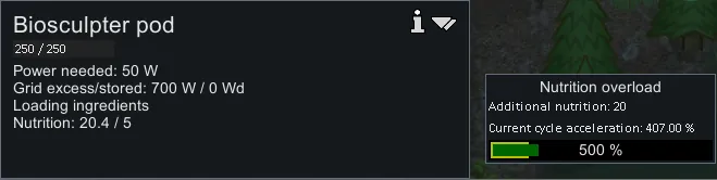 Description Simply adds an ability to overload the biosculpters. As you insert as many nutritions, the cycle is accelerated. Compatible with [url=https://steamcommunity.com/sharedfiles/filedetails/?id=2576257954]Faster Biosculpter Pod[/url].