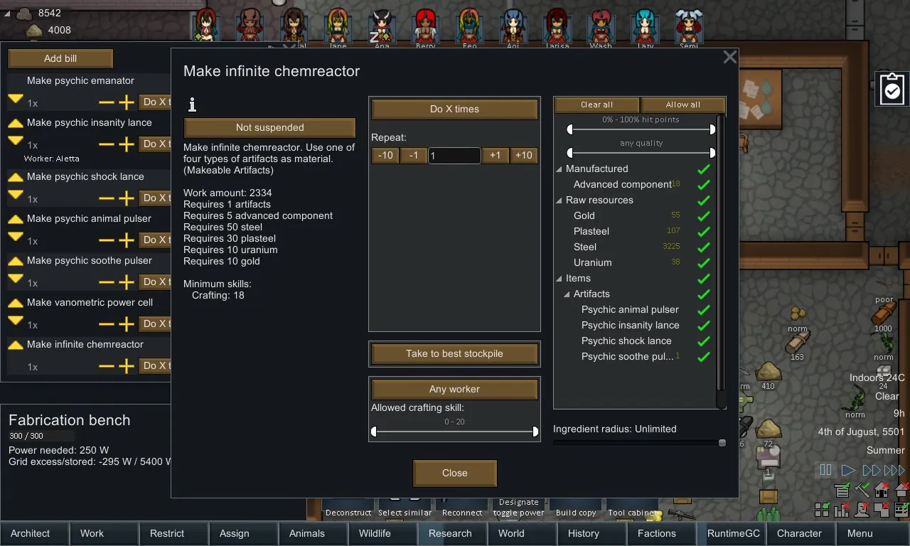 The production of a infinite chemreactor requires one of four types of artifacts (psychic insanity lance, psychic shock lance, psychic animal pulser, psychic soothe pulser) and several other materials.