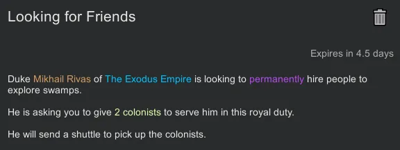 Too often, someone joins your colony, claiming they have nowhere else to go. And because of your Ideology™ (DLC not required), you can't just turn them away! Well, now they *do* have somewhere else to go! This quest gives you a nice, moral way to get rid of colonists you don't want hanging around - on top of a neat reward for doing so. You of course can choose which colonists are sent away.