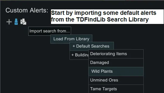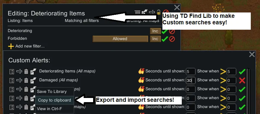 This is an evolution of my old mod [url=https://steamcommunity.com/sharedfiles/filedetails/?id=1706669545]List Everything[/url]. This mod is just alerts, but you can easily share and import/export searches to other mods that use The [url=https://steamcommunity.com/sharedfiles/filedetails/?id=2895299310]TD Find Lib[/url] like [url=https://steamcommunity.com/sharedfiles/filedetails/?id=2895300634]Ctrl F[/url]