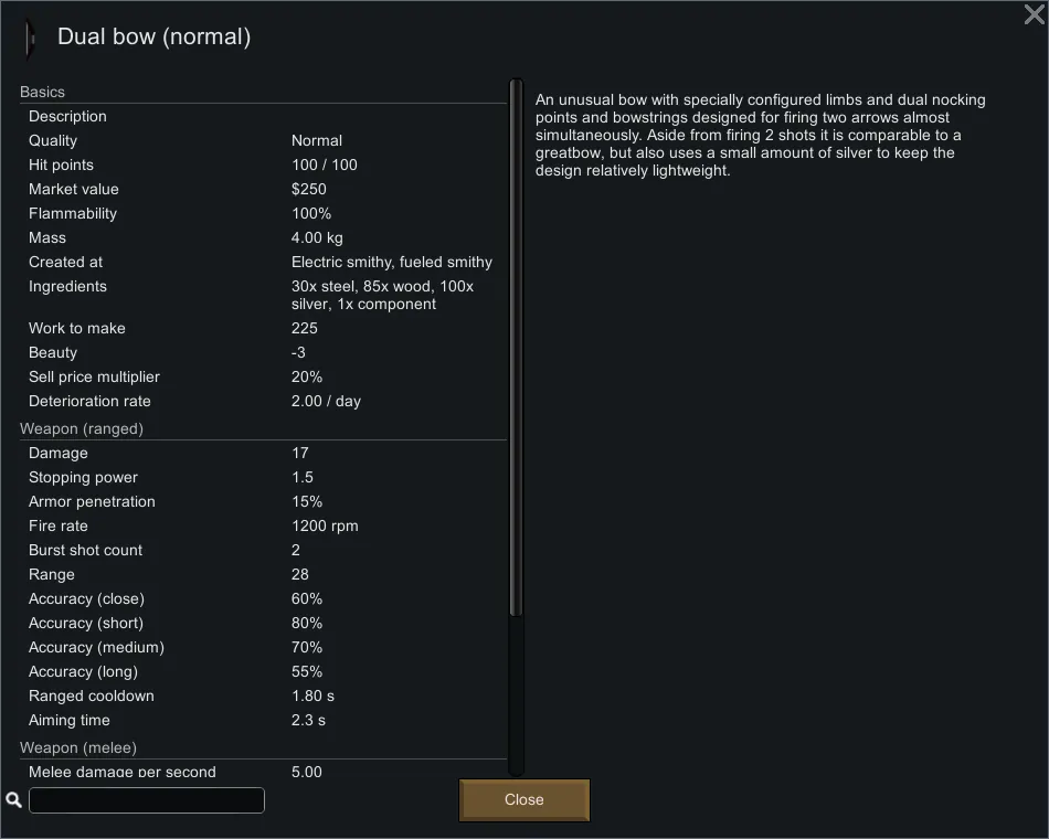 I like playing Rimworld with a tribal start, but I felt like weapons are a bit lacking in the tribal-medieval department, especially multi-shot weapons, so I made some. Except the graphics. Those were made by Cresent. Except the dual bow. That was made by me. I just edited the vanilla greatbow. You can tell because it's ♥♥♥♥. And except the sounds. Those are from something else. What even is a dark souls anyway?