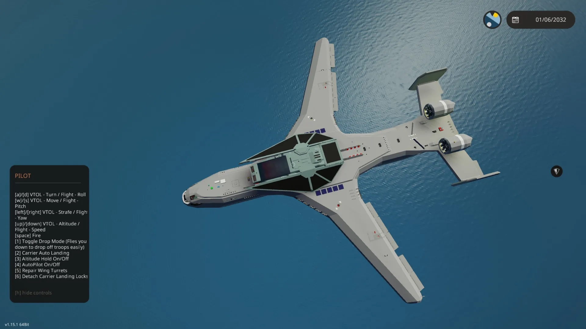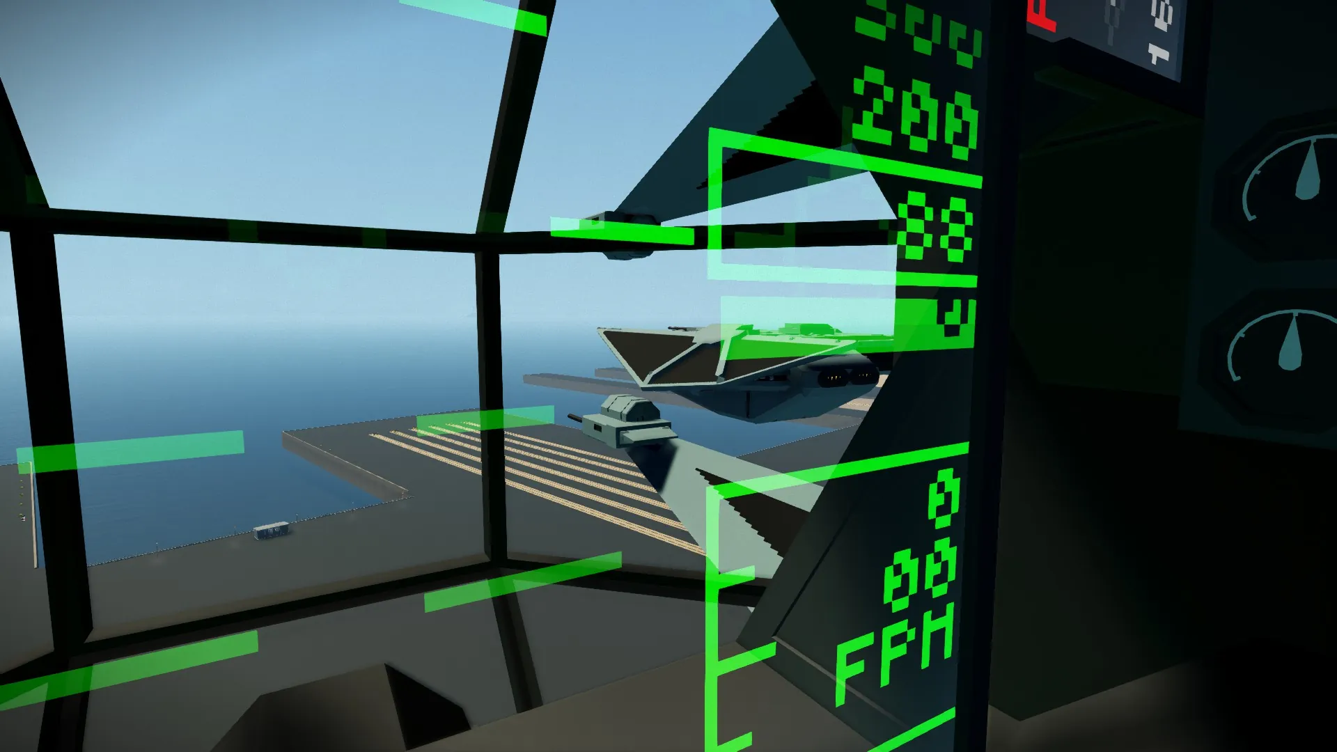 DOCKING WITH WHACKS CARRIER: Its a laser guided system, so make sure you can see whacks docking rails. From there press your 2 key. A indicator will light up, and it will auto control your yaw and throttle. It will also adjust your trim. From there you control your pitch to gently touch down on the docking rails. The auto throttle should set you right above them. Tapping the pitch keys is recamended, because physics causes this aircraft to fly a heavy nose down attitude, and the rails want to be level to connect. It may take some practice, but is easy once you get it.