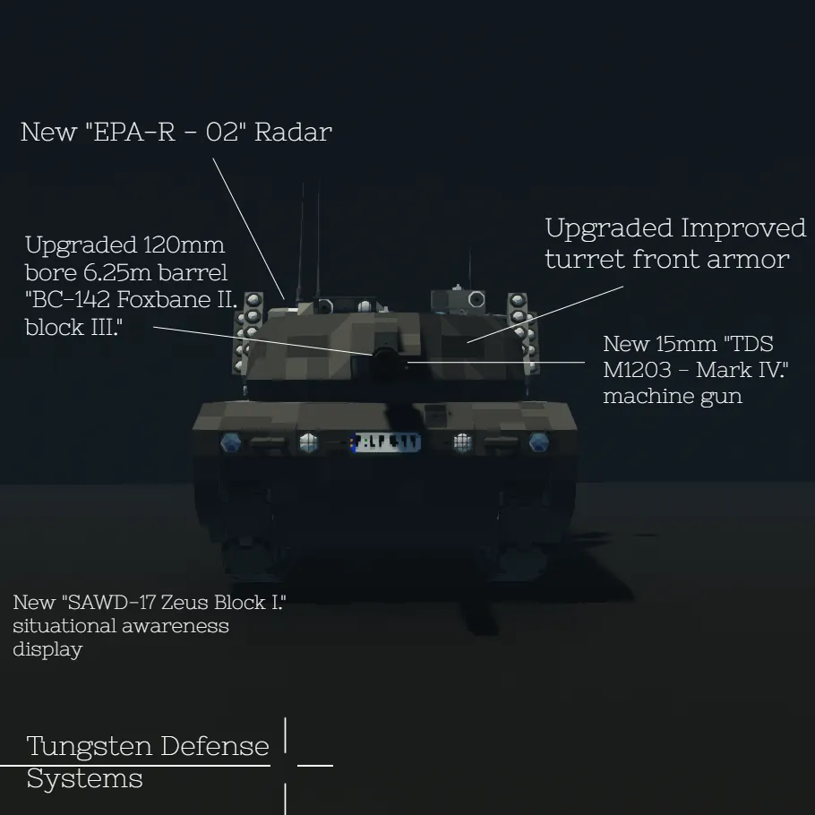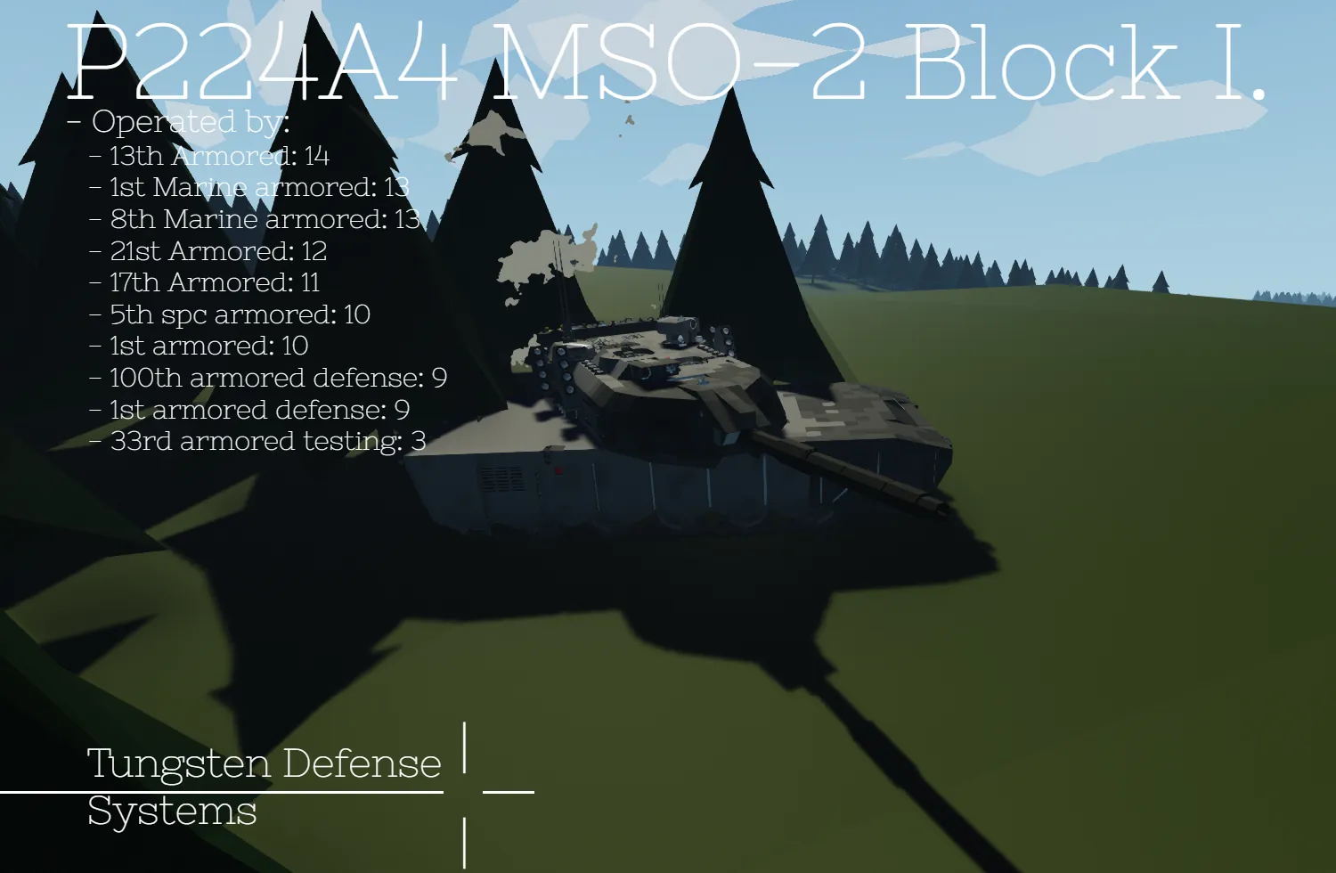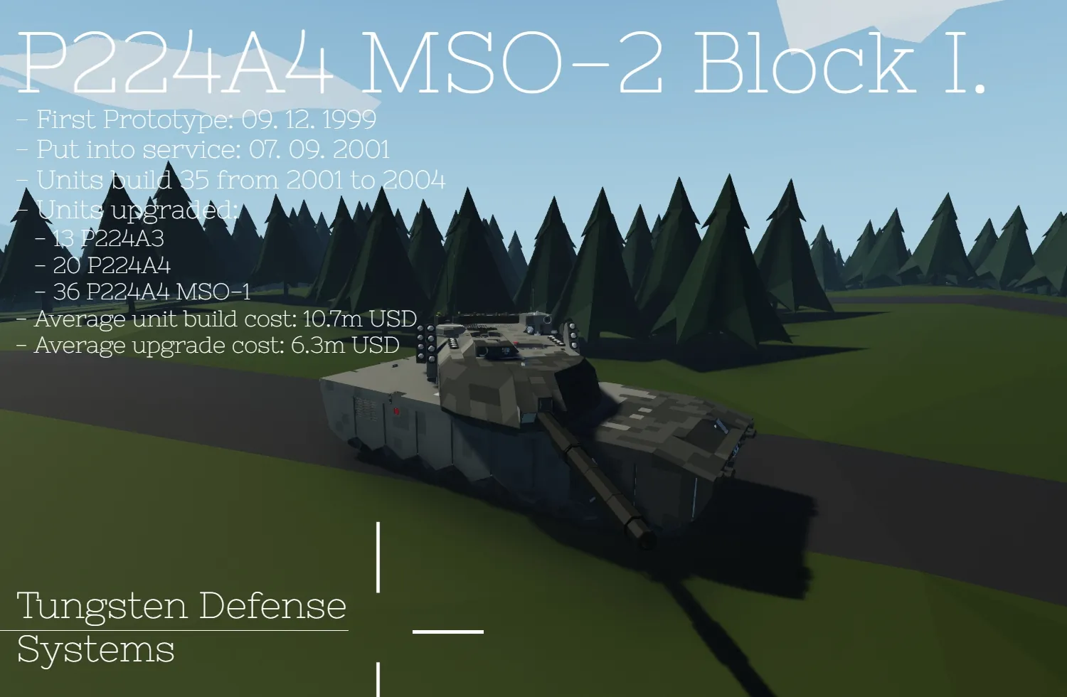 This is the version of theP224 MBT that has been used by the fictional nation of Ladonia from 2002 to 2023. Build and Designed by Tungsten Defense Systems.