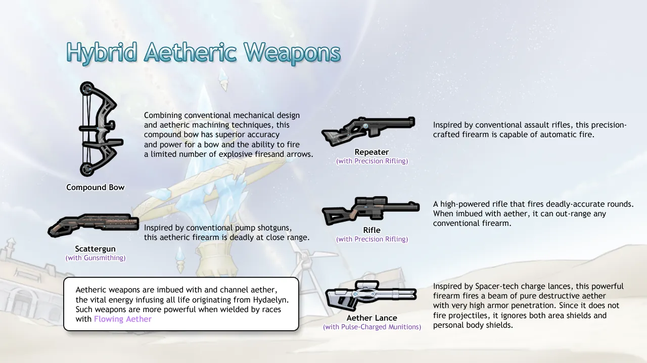 [*] Adds five new aetheric weapons inspired by rimworld's conventional weapons technology. Like all Eorzean weapons, they channel aether and thus are stronger in the hands of someone with flowing aether.