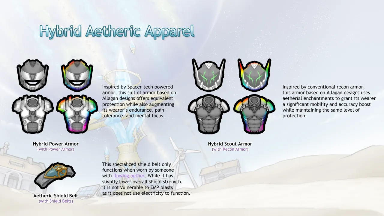 [*] Adds scout armor, scout helmet, power armor, and power helmet as well as glamoured variants. Scout armor is equivalent to recon armor, but with aetherically augmented speed, accuracy, and mental focus. Power armor is equivalent to marine armor, but with augmented speed, pain resistance, and mental focus.