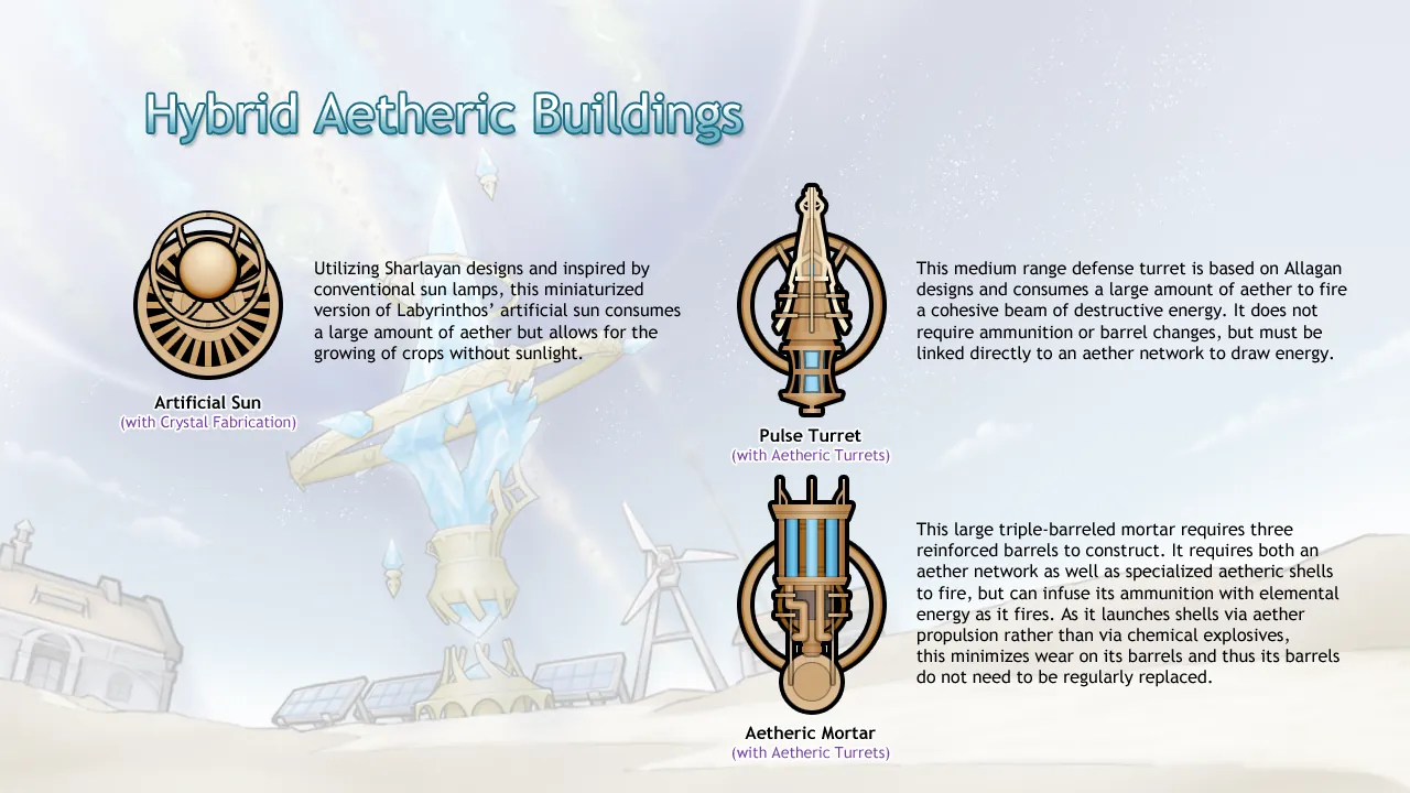 [*] Adds 3 new buildings: an artificial sun that allows crops to be grown indoors with aether, a pulse turret that fires beams of pure destructive aether, and a triple-barreled mortar firing specialized aetheric mortar shells that can be imbued with elemental energy.