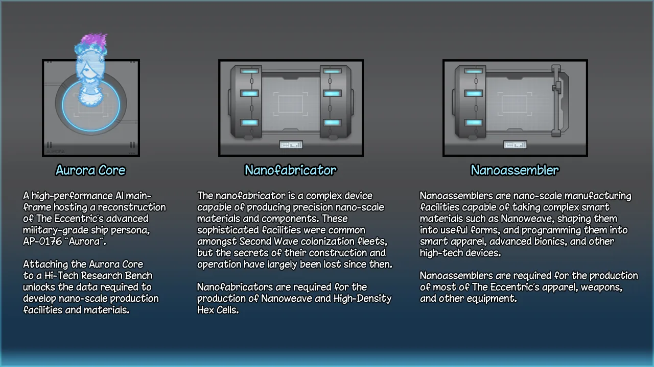 [*] [b]Aurora Core[/b] - An advanced AI mainframe hosting a reconstruction of The Eccentric's military-grade starship persona, AP-0176 "Aurora". Attaching this to a Hi-Tech Research Bench allows the decryption of Aurora's database and the use of her hoarded technologies.