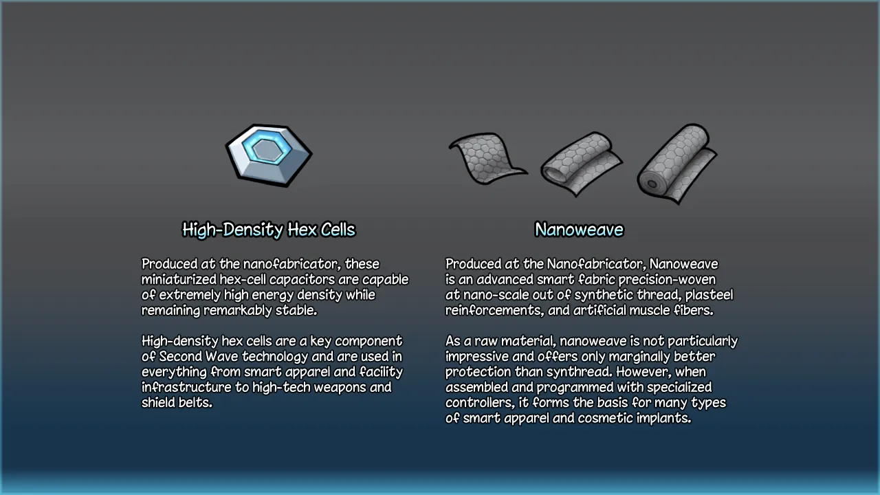 [*] [b]Nanoweave[/b] - A smart fabric comprised of layers of synthetic threads, microscopic plasteel reinforcements, and artificial muscle fibers. On its own it is unremarkable and barely stronger than synthread, but it can be used to produced advanced Second Wave smart apparel and bionic implants at the Nanoassembler.
