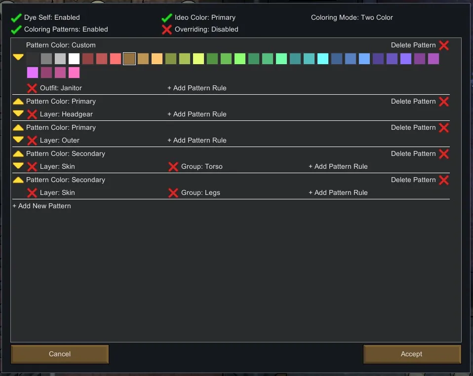 - patterns have higher priority over "random" dyeing, so colonists might not be able to achieve a buff because patters don't allow it.