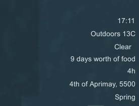 Shows a persistent readout with the amount of food you currently have in storage, and an estimate of how long stocks will last. Prevent sudden starvation by knowing how your food supplies are doing.