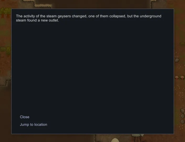 Steam geysers are a sign of volcanic activity, right? Then sometimes existing geysers should disappear, and new ones should appear. And if at the beginning it is not critical, then by the middle of the game it can become a problem. Especially if all geysers disappear from the map.... A separate trouble is that if you have already put a generator on the steam geyser, it will be destroyed in the process of collapse and disappearance of the geyser.