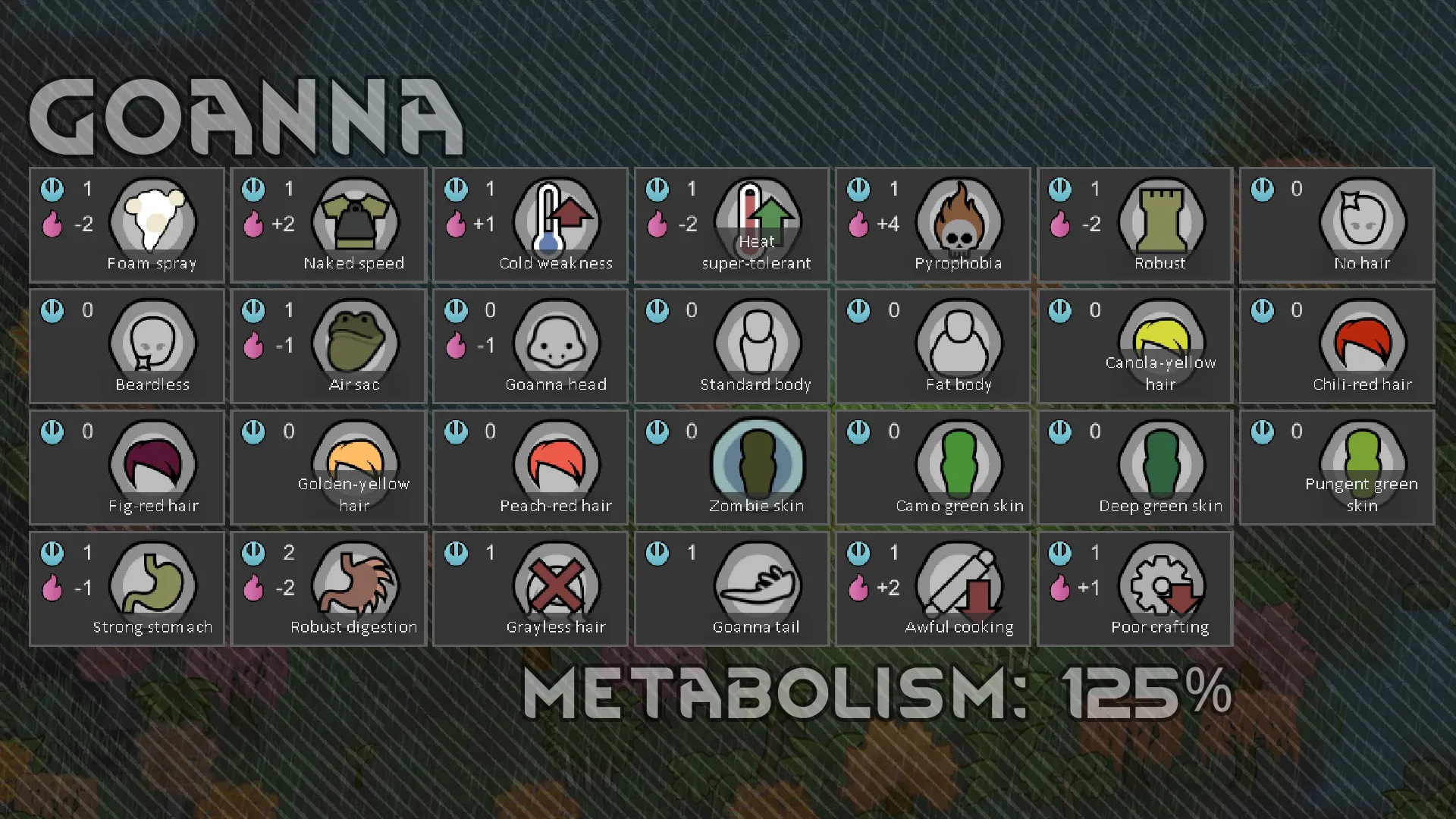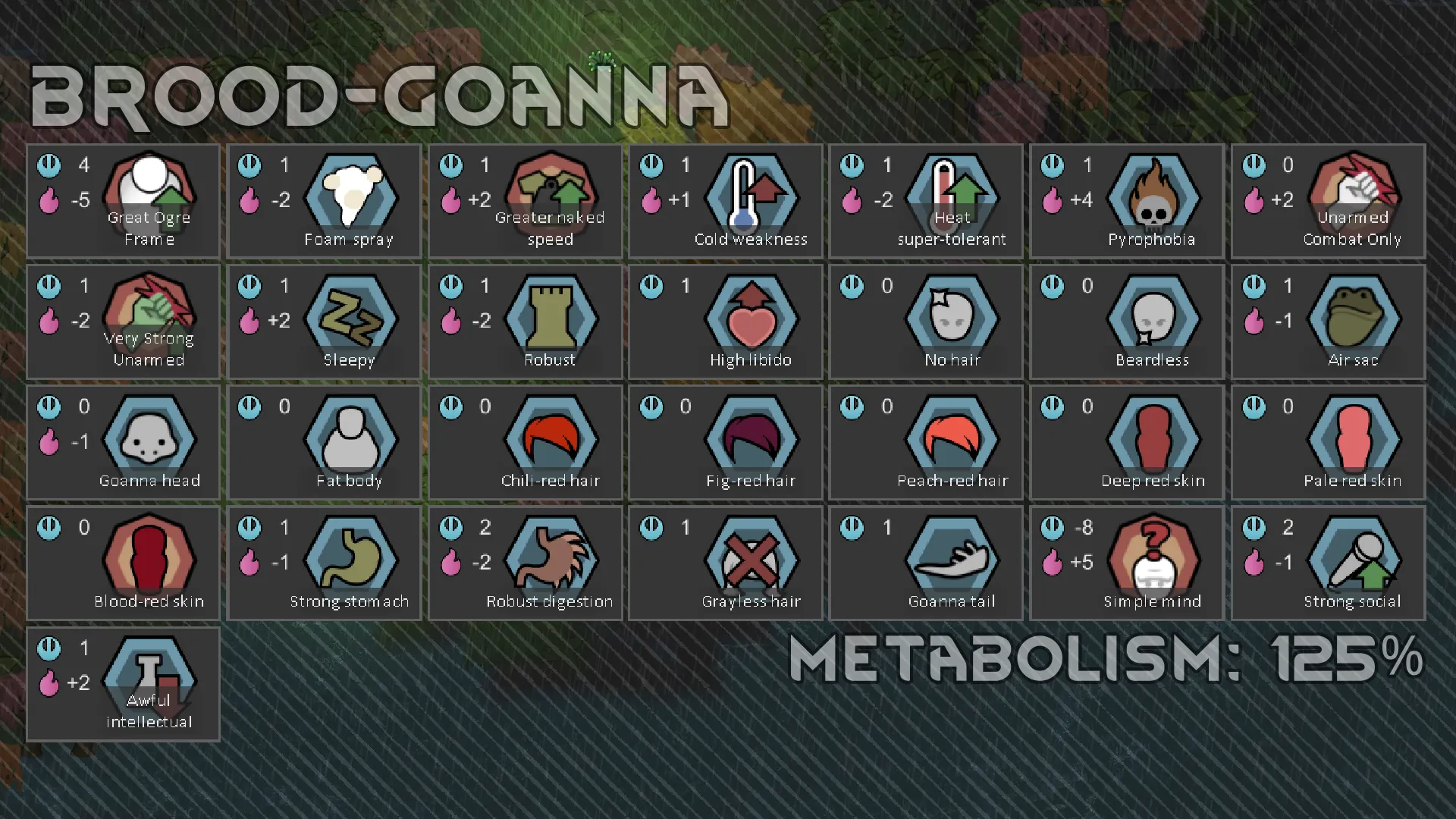 The goanna head graphic and air sac graphic appear to clip slightly in colonist portraits/creation screens. Tried everything I could to fix it, but it doesn't show up in actual gameplay so I'm not concerned.