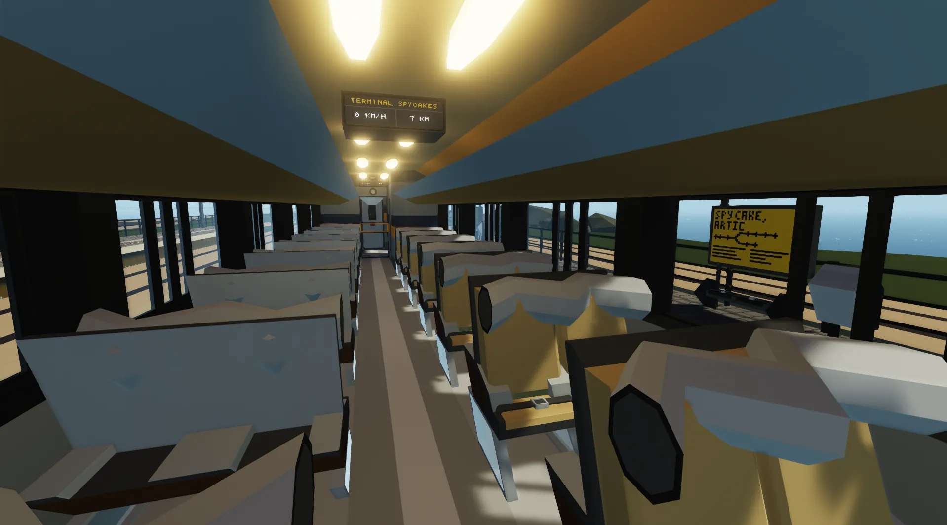 The inside displays cycle trough three screens. These will by default change every 5 seconds. But if you want to override it there is a control screen at the end of each car, by the doors, with four options: "Auto", "Temp", "Speed", "Map".