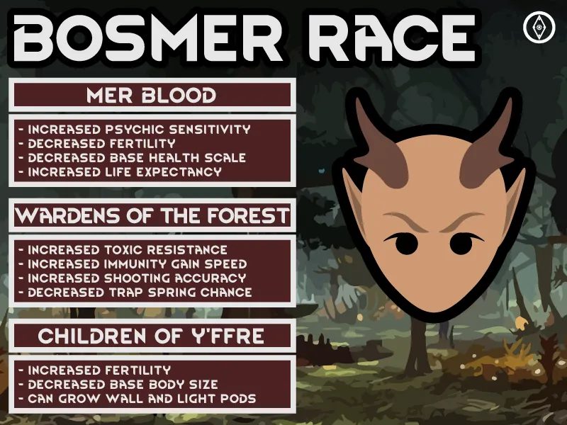 Adds in the Bosmer race, hailing from Valenwood. Bosmer have greatly increased hunting stealth, animal gather speed, animal gather yield, shooting accuracy and immunity gain speed. They have an increased melee dodge chance and movement speed. They have a decreased food poison chance, aiming factor delay, mining speed and toxic sensitivity.