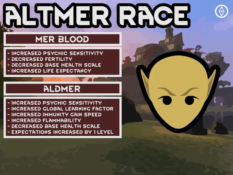 Adds in the Altmer using Humanoid Alien Race Framework. Altmer are fairly similar to humans. They have much higher psychic sensitivity, toxic sensitivity and learning speed. They have an increased social impact, researching speed and immunity gain speed. They have a decreased base health and mining speed.