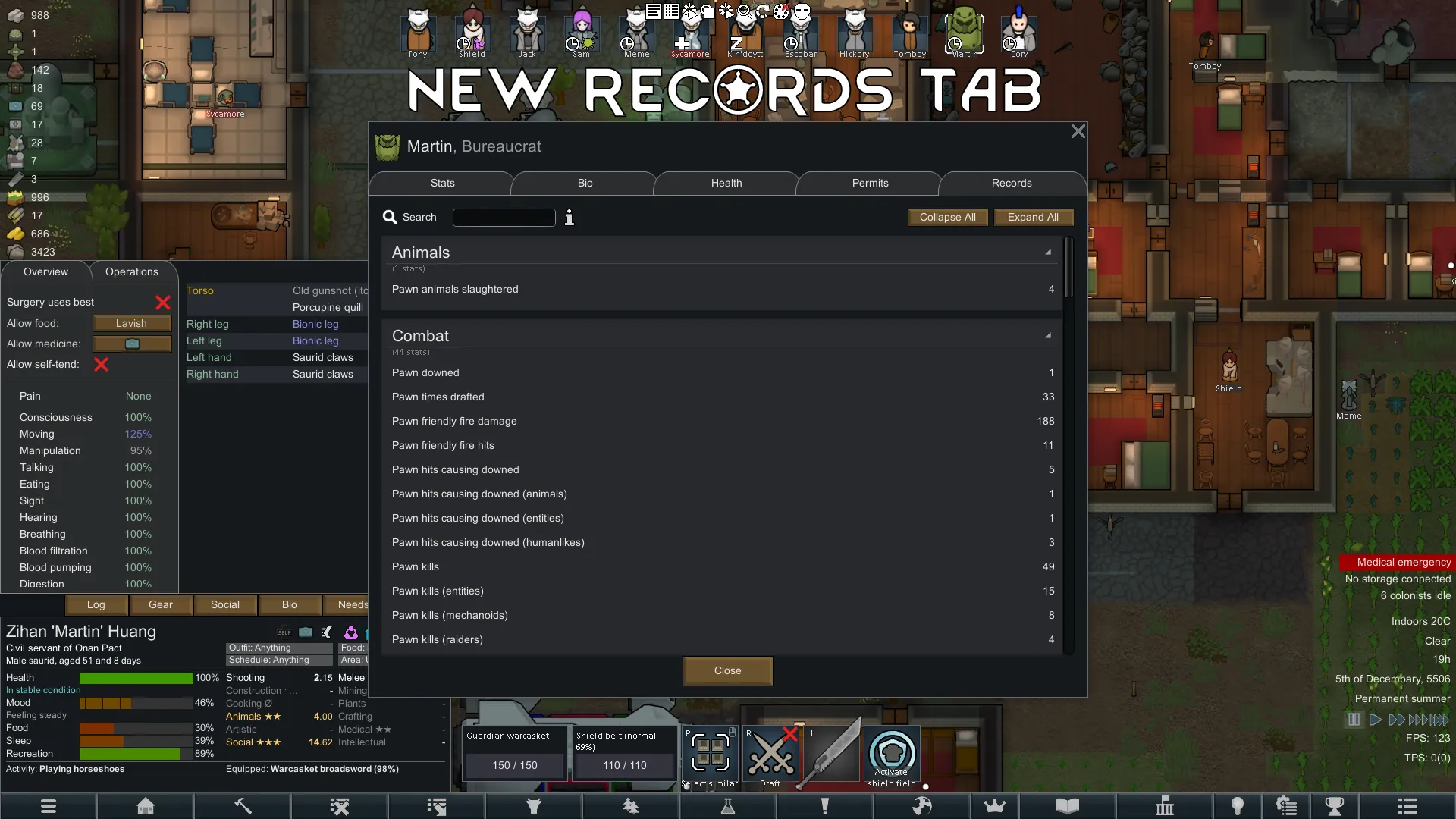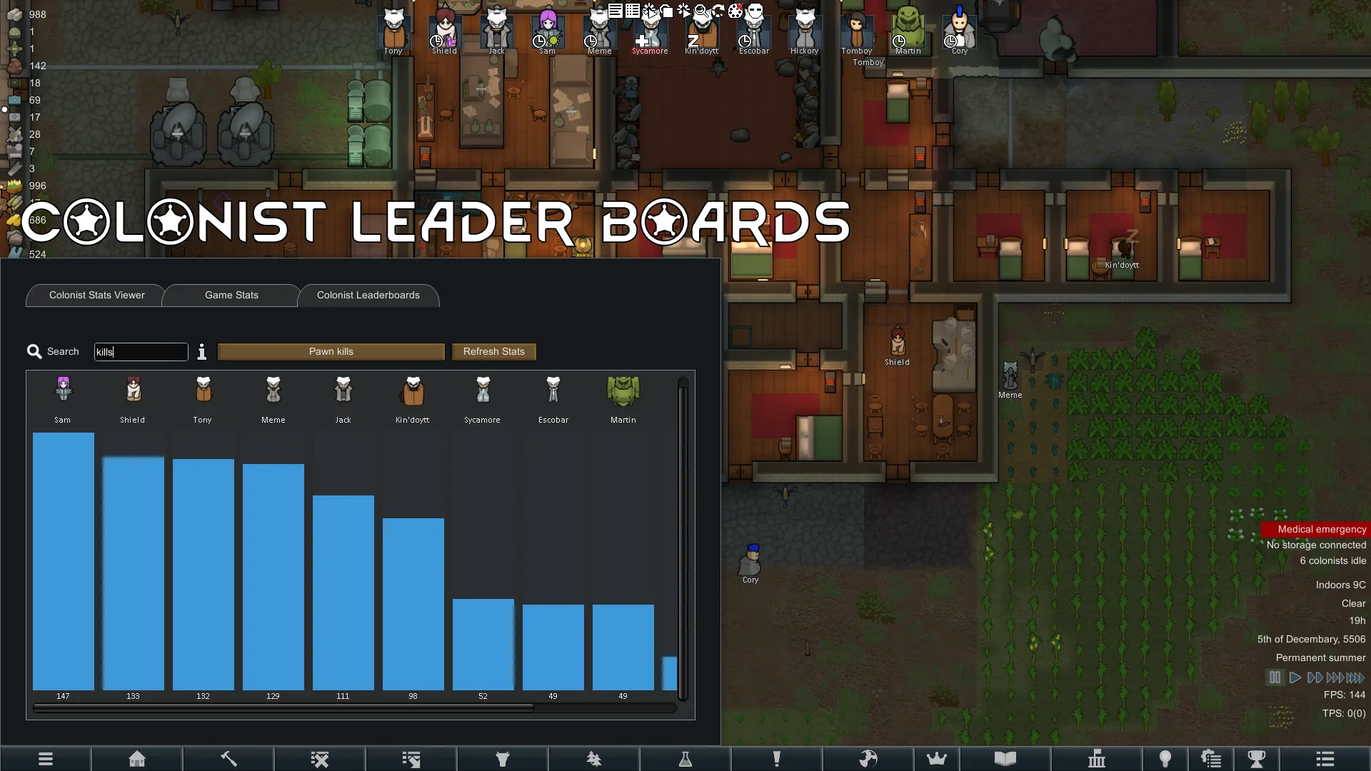 - New window for viewing all colonist stats.