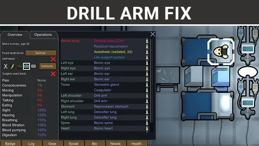 So, what’s the problem with the Drill Arm? It requires natural shoulder to install. Meaning - if your pawn lost an arm in battle, you can replace it with a new and shiny bionic arm but not the drill arm. I’ve been annoyed by this literally for years. And the only way to resolve this problem is by regrowing a whole arm and then installing a Drill Arm. Needless to say you need something like a Healer Mech Serum for this…