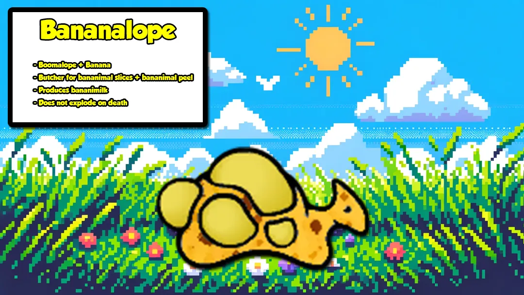 A peaceful, non-explosive genetic cousin of the boomalope. Instead of chemfuel, it can be milked for bananimilk!