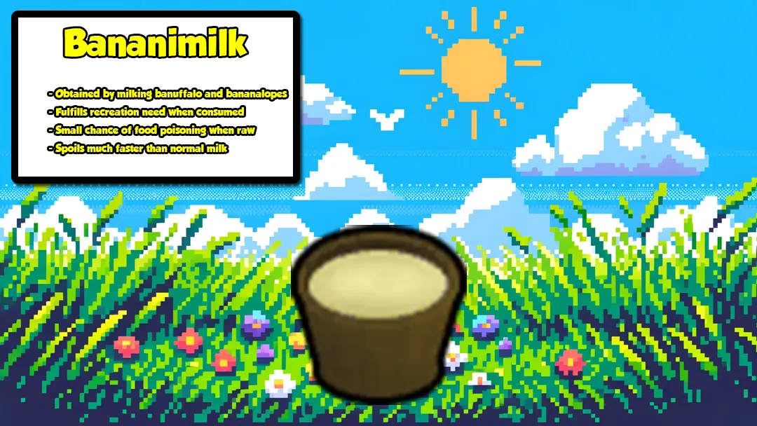 Bananimilk is a delicious treat for colonists that taste just like banana milkshake! Fills pawn recreation, but still has a chance of food poisoning and spoils quickly.