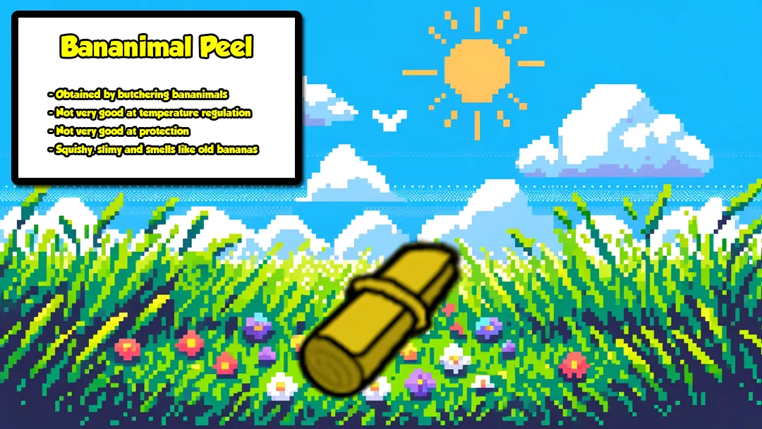 Bananimal peel can be gained by butchering bananimals. It's slimy and smells of old bananas. It's not great for temperature regulation and is very ugly.