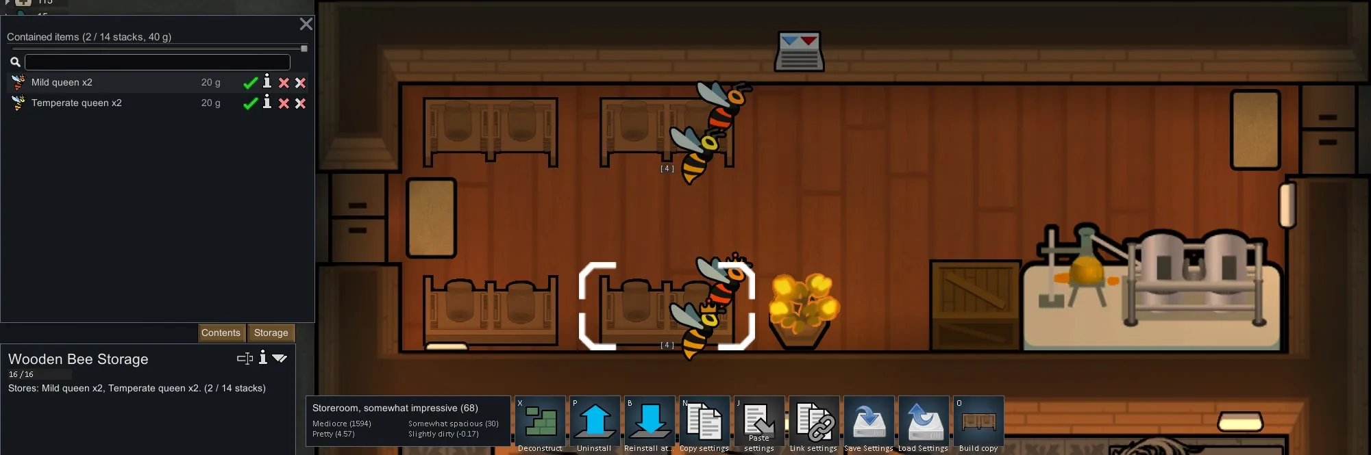 I've noticed that this mod does not work correctly if it is the ONLY mod that adds storage buildings. The patch operation doesn't seem to create the Storage category in the Architect tab correctly. If you're using any mod that adds storage buildings, like [url=https://steamcommunity.com/sharedfiles/filedetails/?id=3201536200]Phaneron's Basic Storage[/url] (which I do recommend) then the Bee Storage should appear as intended. I imagine most people using ASF have some mod that adds buildings that take advantage of it, so realistically this isn't a problem.