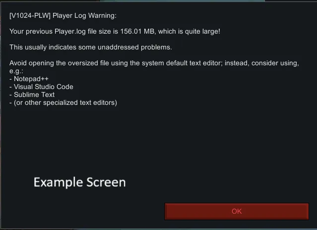 A handy mini-mod to warn you about oversized Player.log, for better situational awareness.