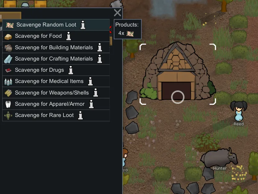If a pawn's scavenging is interrupted for any reason, their progress towards finding loot is saved in a treasure map "unfinished object" (similar to unfinished sculptures). When the same pawn resumes scavenging, they will use the treasure map to continue where they left off. Each pawn's progress is tracked individually, so a different pawn cannot continue another pawn's progress.