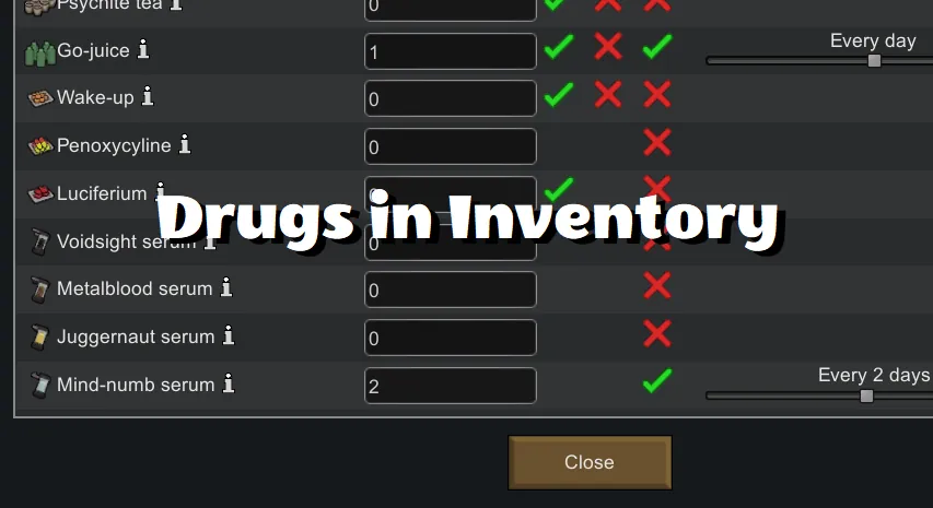 Have you ever noticed that when you schedule your colonists to consume drugs every number of days and also to keep one or more of that drug in their inventory, they don't keep any in their inventory? That's because colonists won't put drugs in their inventory if they are scheduled to take the drug EXCEPT immediately after ingesting the drug according to the schedule and ONLY if they can find more of that drug within 30 tiles. That's weird, right? This mod changes it so that if you tell them to keep the drug in their inventory, they will. Period.