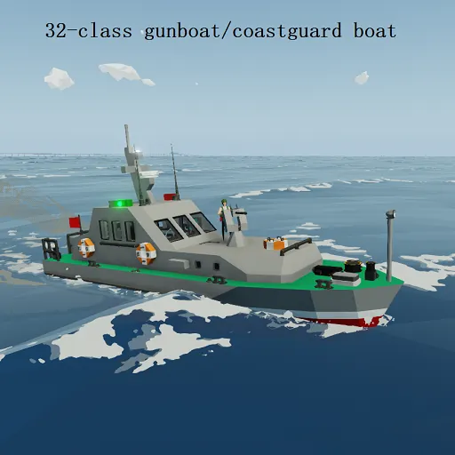 The 32-class (fictional) boats are small gunboat/coastguard boats, they are cheap and quick to build so they can be mass produced. Many countries have bought these boats. They have modern equipment, and their small size makes them excelent for coastal / river duties. Thanks to the shape of the superstructure the radar siluette of the 32-class is very small, thus the boats are hard to detect. This boat is loosely based on an RC ship which i saw [url=https://steamcommunity.com/linkfilter/?u=http%3A%2F%2F%28https%3A%2F%2Fprofimodel.cz%2Fen%2Fstavebnice%2F280521-p-23-patrol-boat-kit-8596450007680.html%29](https://profimodel.cz/en/stavebnice/280521-p-23-patrol-boat-kit-8596450007680.html)[/url].