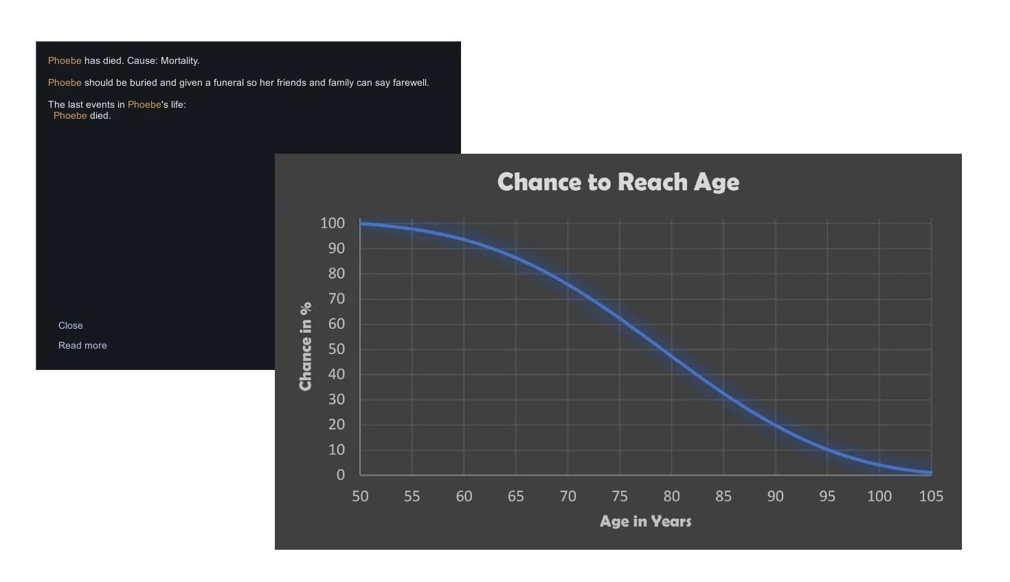 # The chance values for triggering Mortality are reduced by about two thirds. Mortality can first affect a (humanoid) pawn with a regular lifespan on their 50th birthday with a chance of 0.3%, and on every birthday after that with increasing chance. Calculations and testing showed that survival rates for humanoid pawns are roughly (also see preview image):