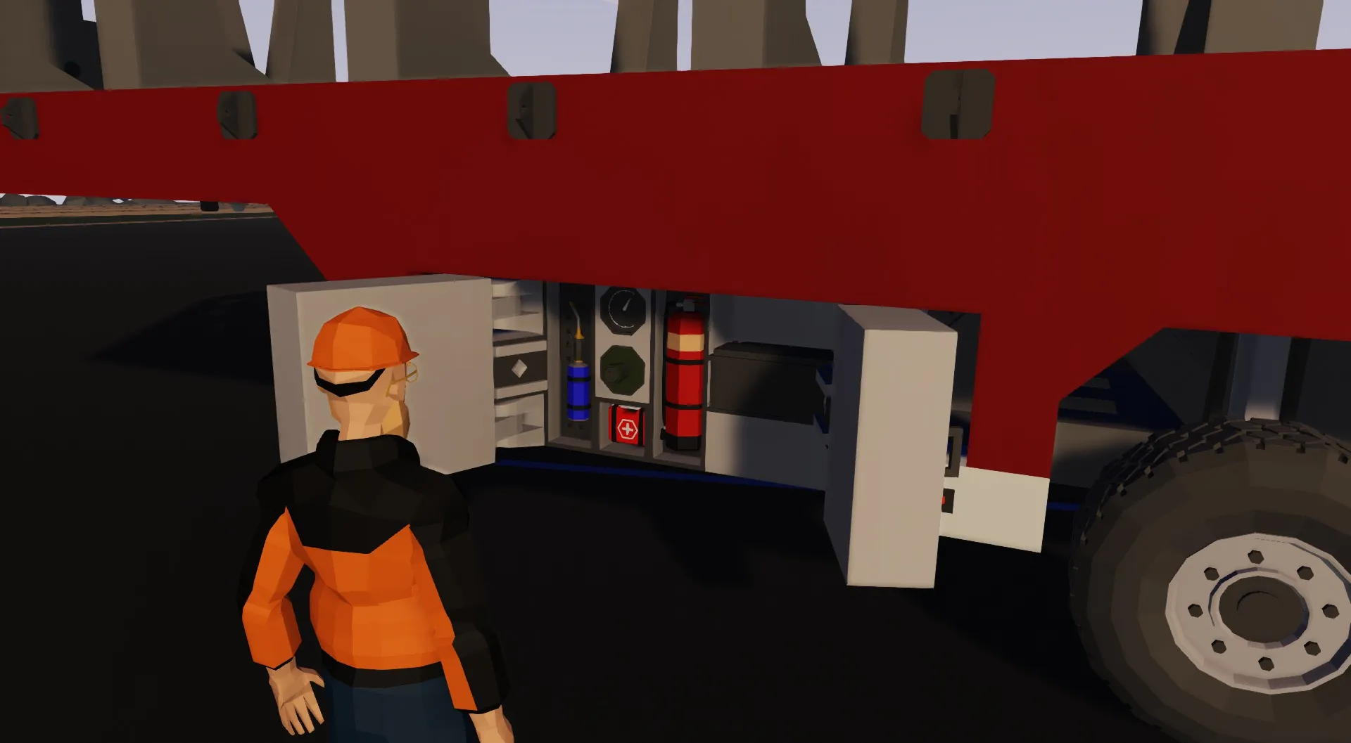 [*] Cabinets with spare cables and hoses, extinguisher, torch and first aid kit