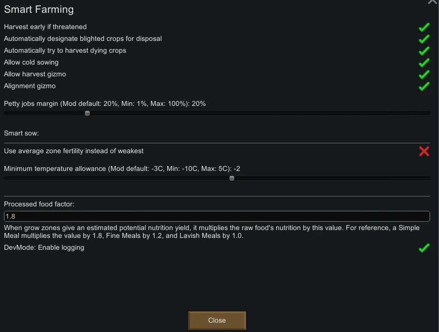 [*] [b]Smart sow:[/b] When enabled, pawns will not bother sowing plants if there's no chance of the plant reaching its minimum growth (typically 65%) before it is expected to die from the cold or toxin. This is especially helpful for users of [i]Seeds Please[/i] to avoid wasting seeds.