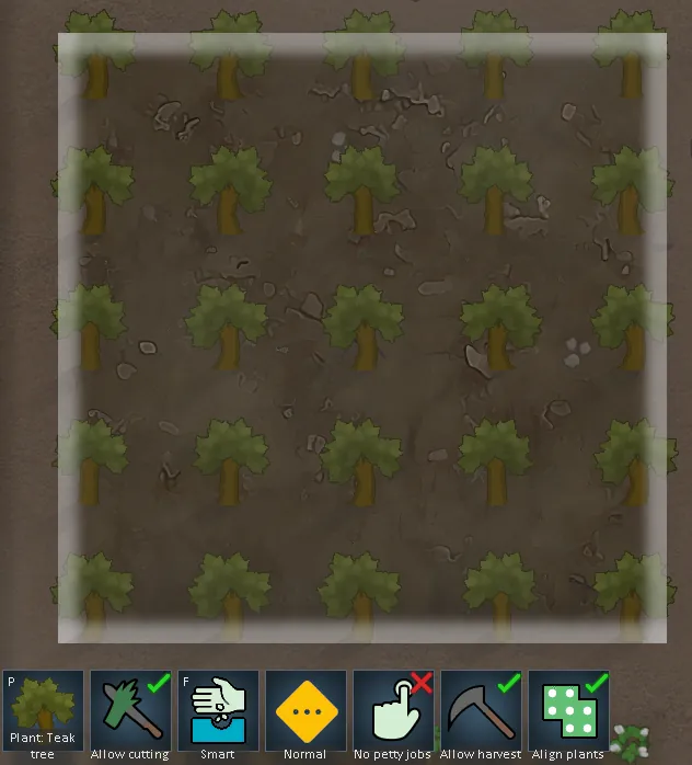 [*] [b]Align plants:[/b] If plants need the cells around them clear (like trees), you can toggle alignment mode and pawns will plant in clean rows, as opposed to scattered about randomly.