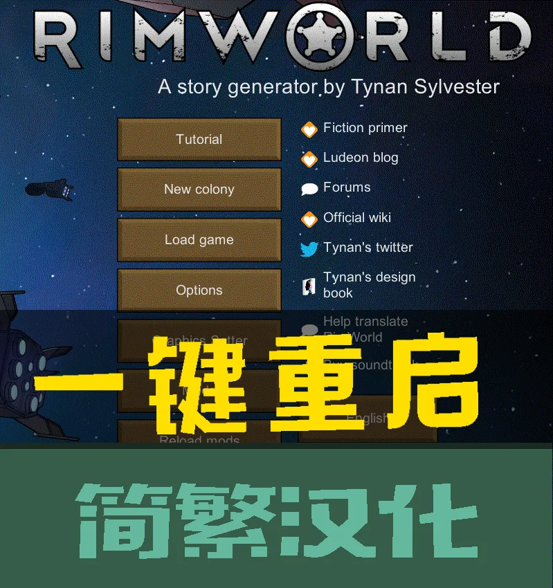 在开局菜单和游戏内菜单添加「重启游戏」按钮,配合Rimpy方便测试mod。