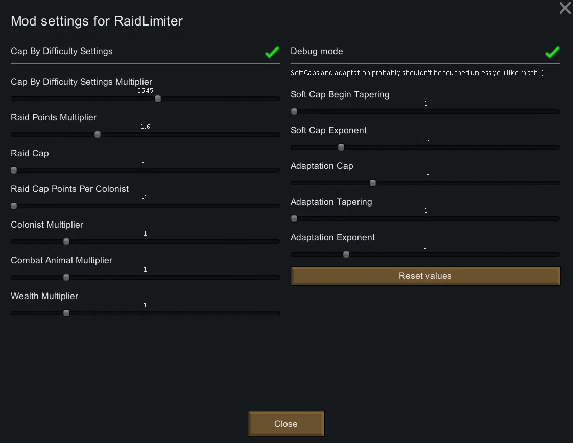 -RaidPointsMultiplier: This is not a cap, but just a straight multiplier on top of your difficulty. Maybe you want Rough, but slightly less rough? In that case you can choose rough with your storyteller and choose 0.9 here for example. Or maybe you want extreme's other effects but not it's raid sizes? Choose extreme and 0.5 here.