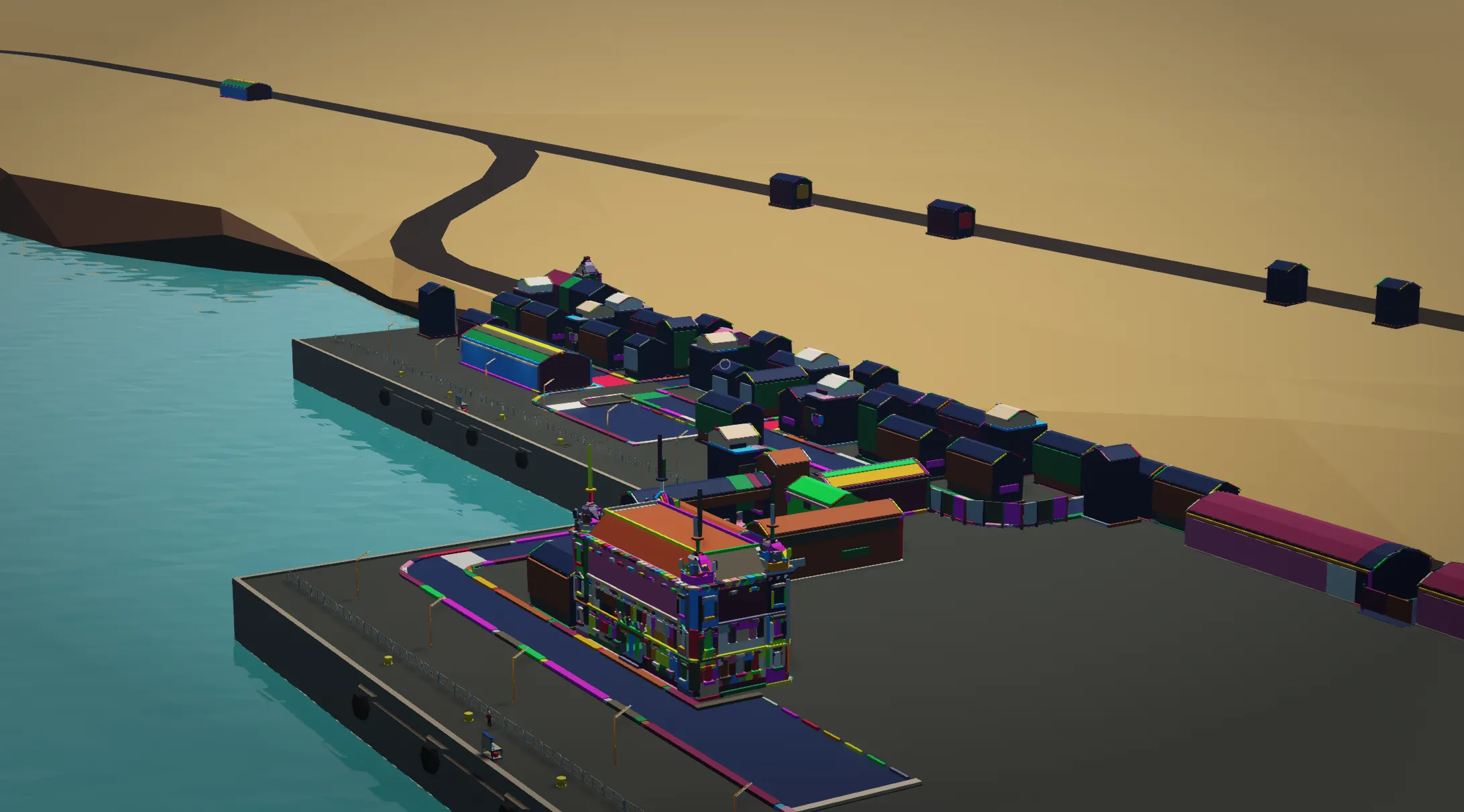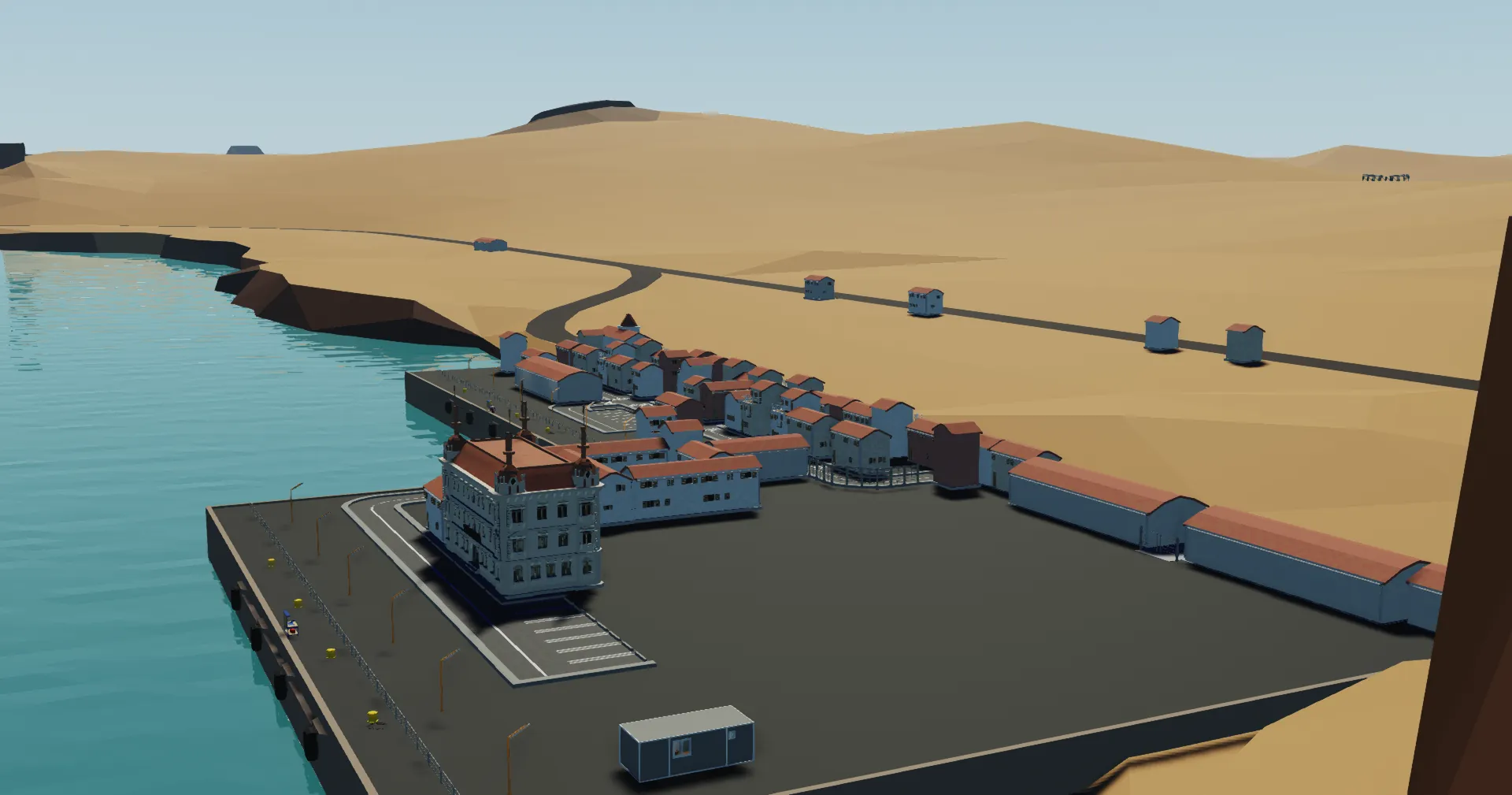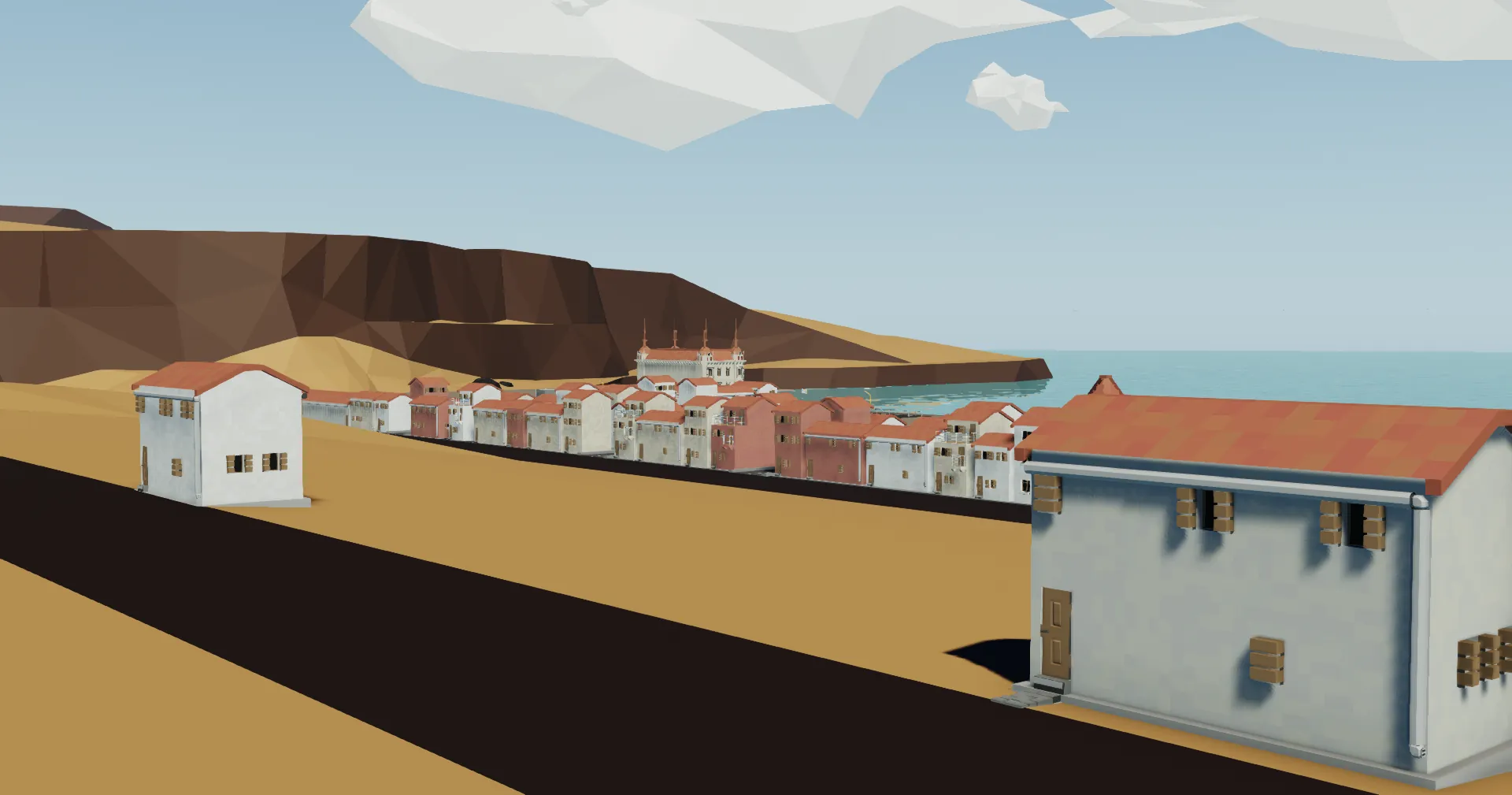 The City includes 4 variants of houses with each house having 3 colors with views of the ocean. Has Roads and alleyways with 2 parking lots. At the East end of the city there is a capital building with accesible rooms.