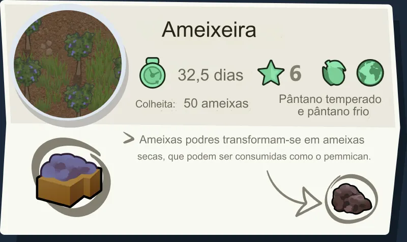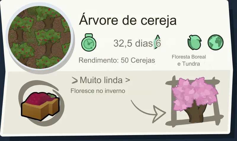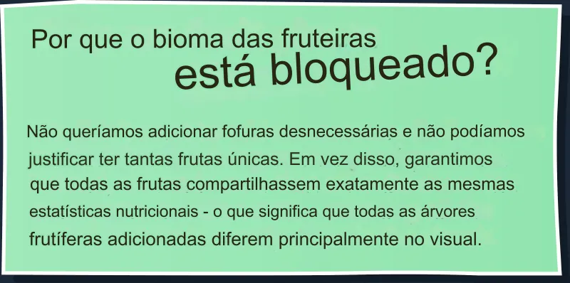 As árvores frutíferas são bloqueadas por bioma para duas novas árvores frutíferas exclusivas por bioma, no entanto, tenha em mente que elas não diferem entre si em termos de nutrição - o que é em parte a razão pela qual decidimos bloqueá-las por bioma. Também não queríamos inundar seus menus agrícolas com 12 árvores frutíferas diferentes que produzem praticamente o mesmo item, mas com nova casca. Tudo isso foi feito pensando na facilidade de uso.