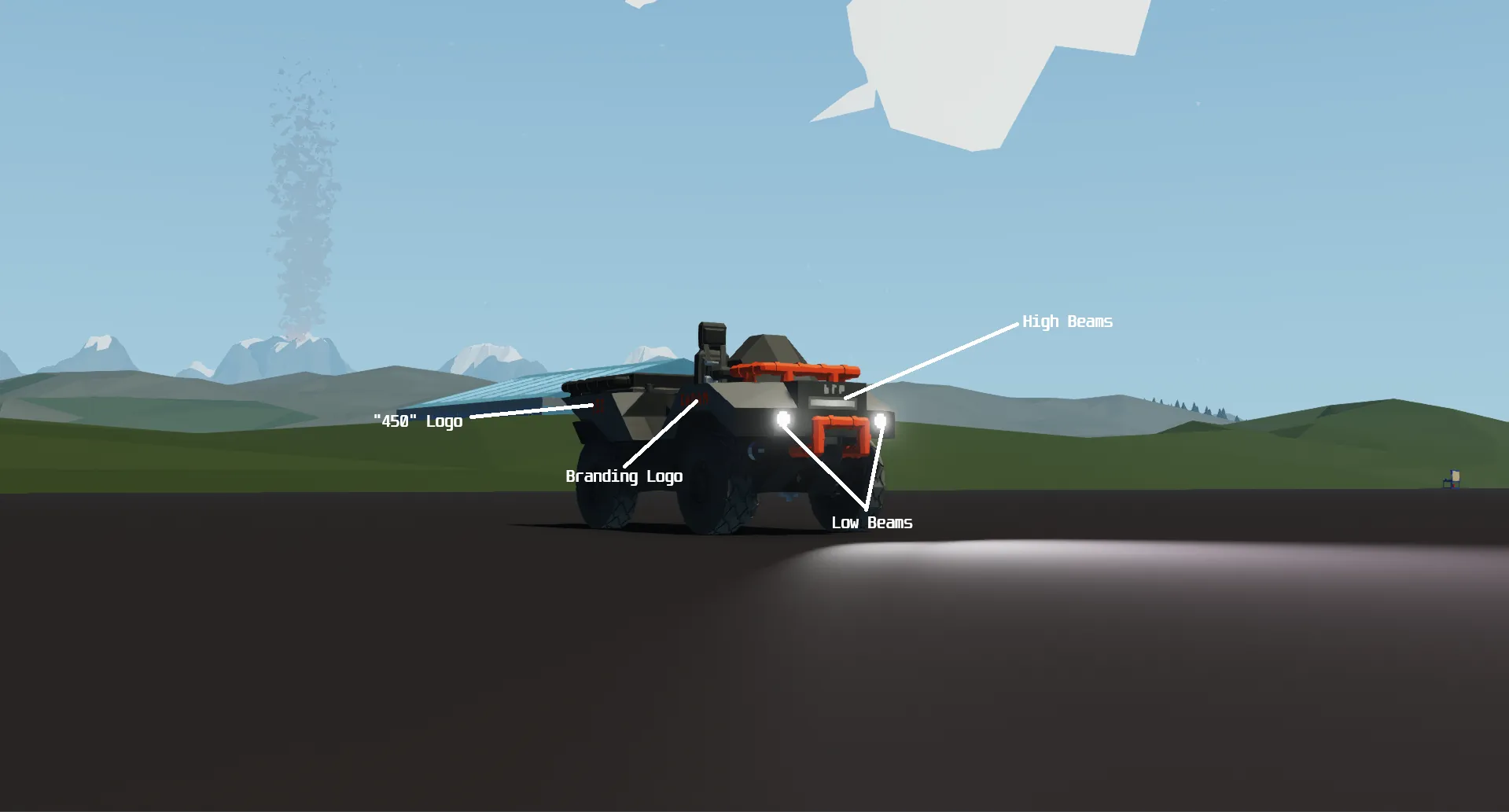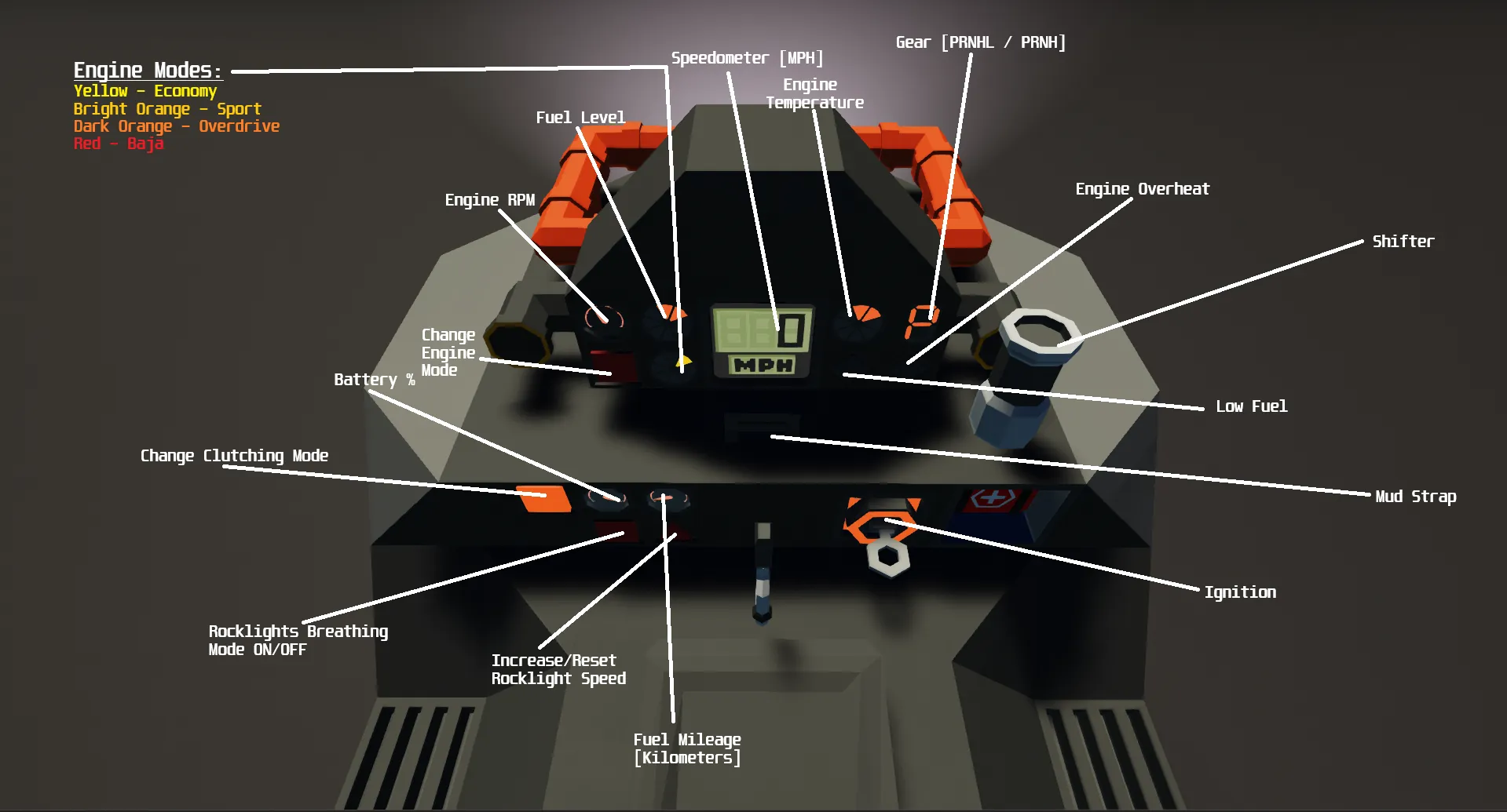 When spawned (unless locked) the ATV will automatically spawn in 'Economy Mode' [Yellow]. To change modes, click the "[b] Change Engine Modes [/b]" button, After one click, you should then be at 'Sport Mode' [Bright Orange]. Click again to go into 'Overdrive Mode' [Dark Orange]. Then, again, to go into the last, and final mode: 'Baja Mode' [Red].