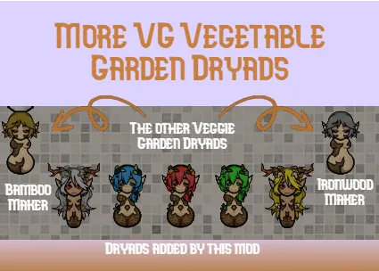 This mod adds five more Dryads for [b]VG Vegetable Garden[/b]. Three are variants of the default [i]Berrymaker[/i]; the Blueberry, Gooseberry and Cloudberry Makers, the final two are variants of the [i]Gaumaker[/i], the Honey, and Mushroom Makers.
