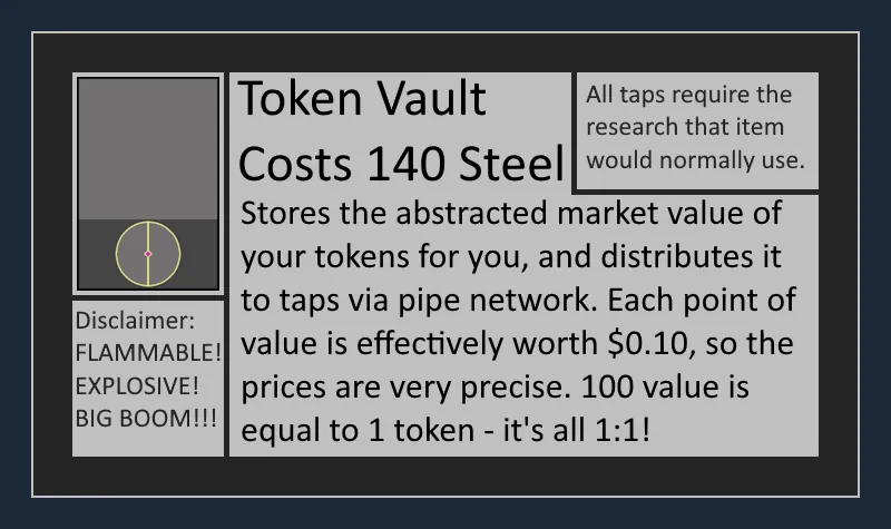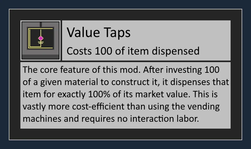 Unlike the base mod, this requires research. It also requires 100 of the item produced in order to make the tap for it. Taps exist for building materials, drugs, medicine, tokens, raw food and meals. As a benefit for the added hassles of research and already having to own a lot of something to start mass producing it, you get a much better rate of tokens to items. There is no markup. You have seized the means of production.
