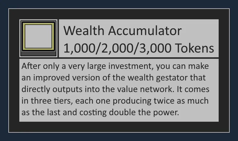 Also adds accumulators, the stronger cousins of the token gestator. They store their tokens directly in the network, so you don't even have to haul anymore. Become lazy. Let Randy punish you for your greed when you start to slack off.