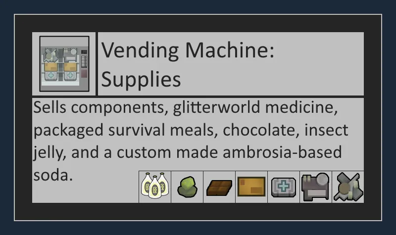 The vending machines are glorified spots. They don't require anything to build, they just appear. The supplies vending machine covers the things you can't really go on without - food, some recreation, and components. The resources machine has the rest of your building needs. There's another machine for fabrics and one for drugs, too.