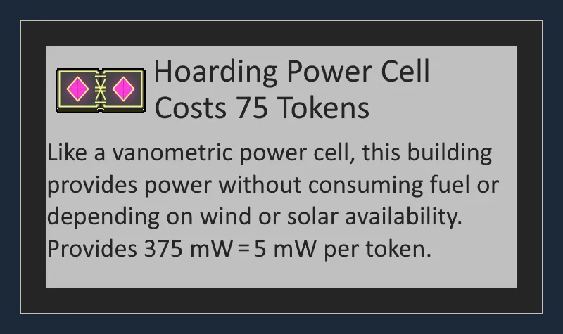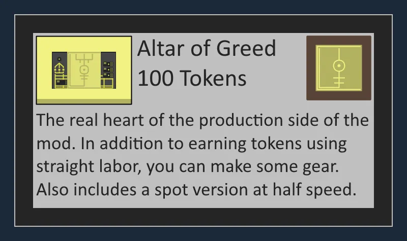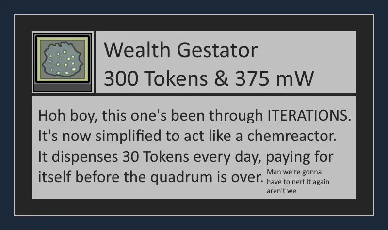A nice big tokenberry farm or a line of altars of greed can secure you plenty of wealth, but you can now build wealth gestators for 300 tokens. They explode when damaged and require as much power as a hoarding power cell makes, but produce 30 tokens every day.
