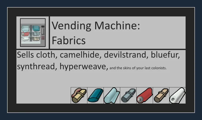 Overall, this is a mod for convenience over efficiency and simplicity over robustness. If the thought of having to wait for a trader or set up a caravan for something kills your momentum, saps your enthusiasm, or otherwise just discourages you, this mod is for you. While my sandbox mod was effective at killing my executive dysfunction around some colony tasks and smoothing over burnout, it wasn't particularly fun and is mostly good for testing. This mod was a second approach. It takes time and colonist labor for results, but doesn't require any special quest/trade exclusive items at any point. In fact, it sells a few of those itself...