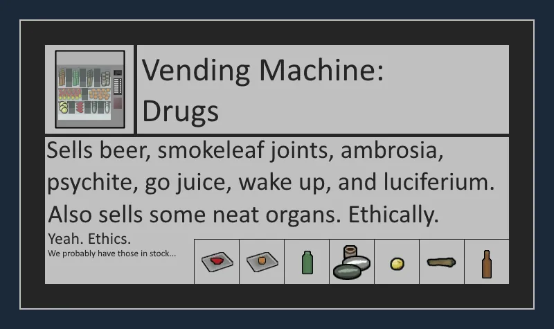 [*] Vending machine for psy stuff, and another one for biotech. I don't think another machine is appropriate at this point. I'm just going to start adding psy stuff to the altar.