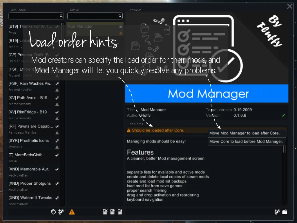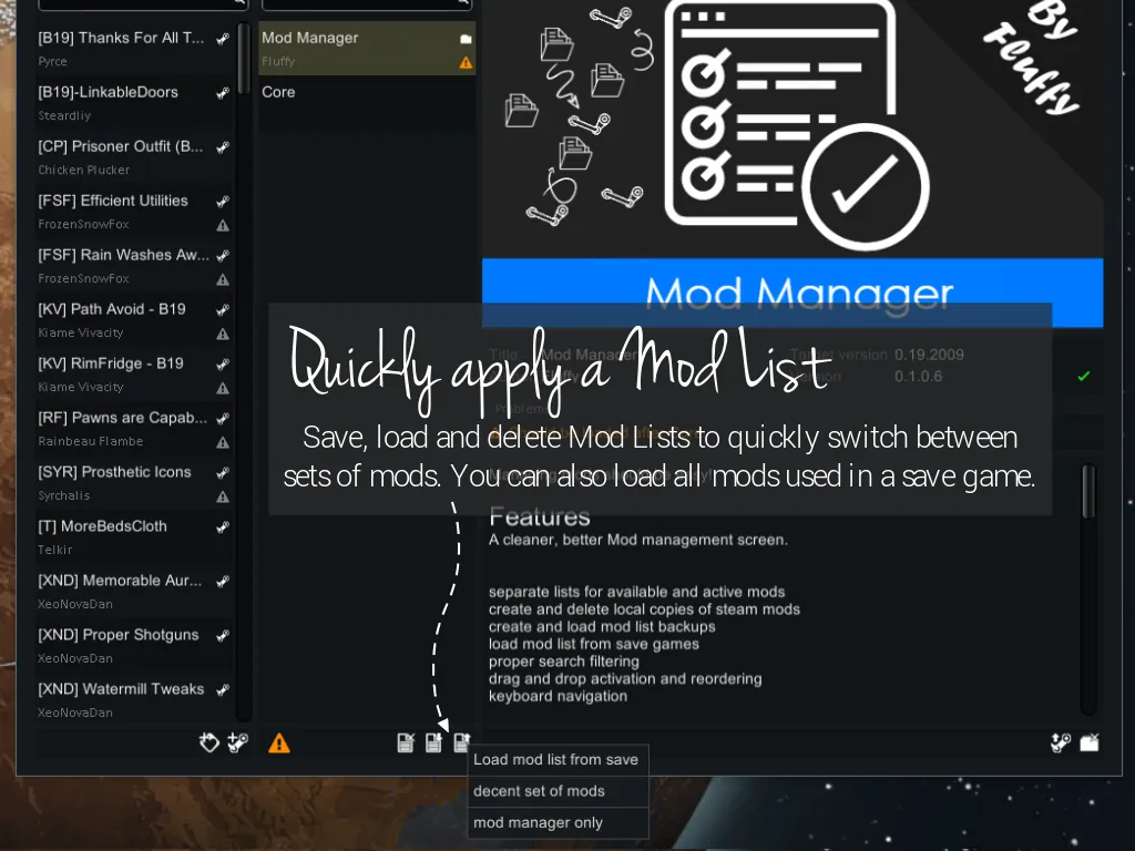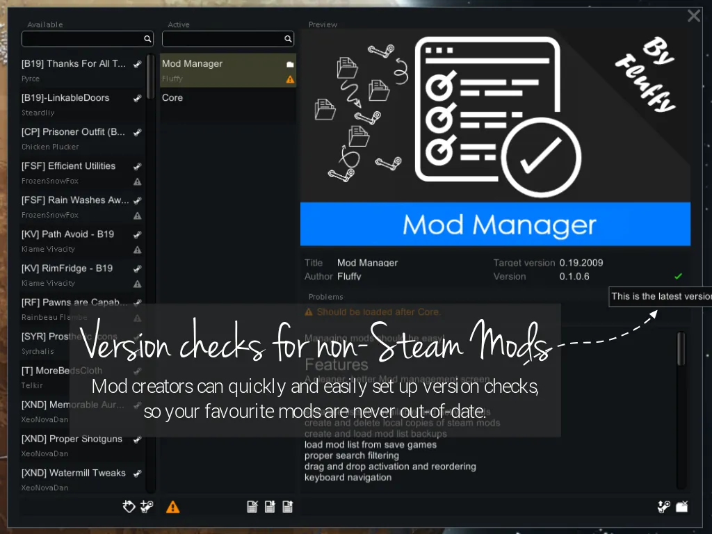 All current and past versions of this mod can be downloaded from [url=https://steamcommunity.com/linkfilter/?u=https%3A%2F%2Fgithub.com%2Ffluffy-mods%2FModManager%2Freleases]GitHub[/url][github.com].