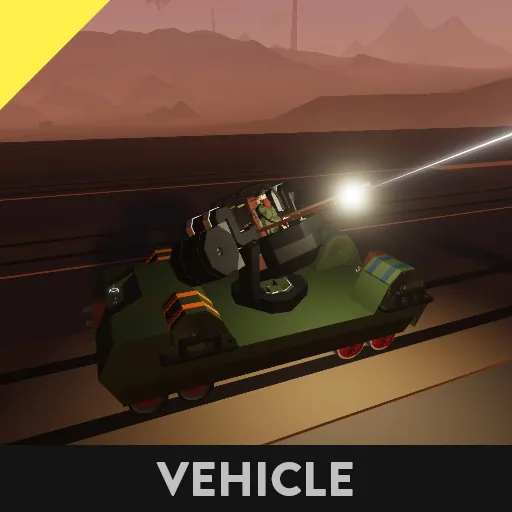 It is a simple AA car for defending your train from aircraft. This model is in fact selfpropelled and uses electric engines to reack around 70 kmph. It has even less ammo with now only four droms so for longer engagements it is recommended to bring an ammo car. Controls are very simple, aim with your camera and fire with space, you can also enable brakes from your seat. Make sure to unlock the turret before firing. Enjoy!