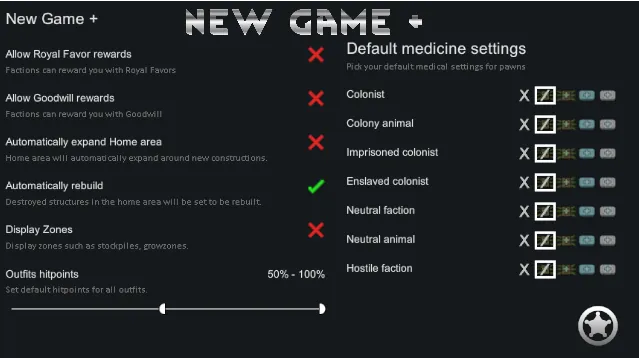 [*] Medical settings, set the default medical settings for each pawn categories.